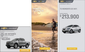 En la campaña con mayor impacto del mes, Chevrolet informa y promociona mediante un mensaje directo destacando el precio de cada modelo, destacando tasas de 0% de interés y bonificaciones dependiendo del modelo del auto.